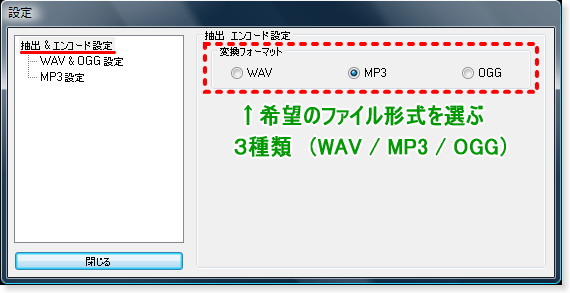 ここで変換フォーマット/保存したい形式を選びます。 変換可能な形式ファイルは WAV(WAVE)、MP3、OGGの3種類です。