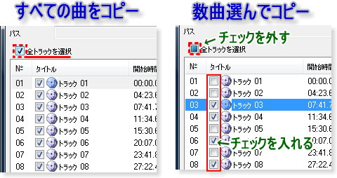 「全トラックを選択」のチェックを外して、希望の曲(トラック)にチェックを入れます。