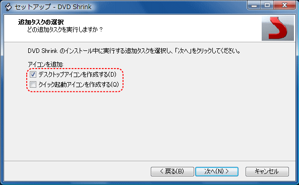 ここではチェックボタンで、デスクトップアイコンとクイックアイコンの作成の有・無を指定する事が出来ます。
